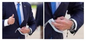 In the pictures below, you’ll notice his thumb is bent inward, but is not holding anything. Not many people do that with their thumb for no reason (he might think it’s helping hold the face diaper, because it’s numb and he can’t feel it). Also notice he’s not really grasping the mask; it’s just lodged between two fingers slightly. All this while his handlers tell him to give a thumbs up, like he’s just fine to run the country, have direct access to the nuclear codes, and promote more communism with a new puppet leader.